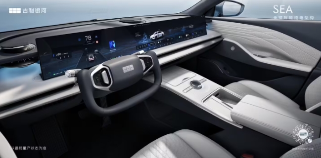 內(nèi)飾方面,最引人注目的就是這塊 45 英寸 8K 顯示屏,有效顯示區(qū)域尺寸達(dá)到 1130 毫米 * 138 毫米,從駕駛位左側(cè)一直延續(xù)到副駕右側(cè),幾乎貫穿了整個(gè)中控臺(tái)。大屏還采用了超薄設(shè)計(jì),厚度為 9.8 毫米。內(nèi)置的車機(jī)系統(tǒng)支持游戲應(yīng)用,可以通過手機(jī)或者手柄進(jìn)行控制,在 P 擋狀態(tài)下,用戶可以用這塊屏幕來打游戲。據(jù)悉,新車將搭載高通驍龍 8295 旗艦級(jí)芯片,以及吉利全新的車機(jī)系統(tǒng)。