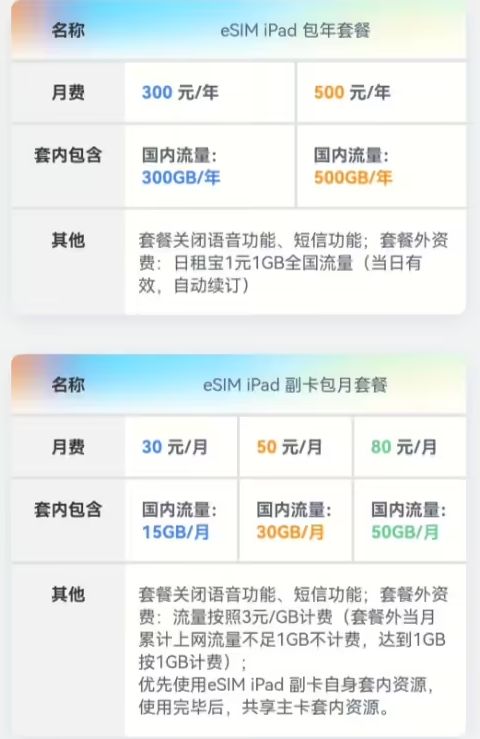 據(jù)介紹,eSIM iPad 包年套餐提供 300 元 / 年和 500 元 / 年兩個(gè)價(jià)位,分別提供 300GB / 年和 500GB / 年的國(guó)內(nèi)流量。該套餐關(guān)閉了語音功能、短信功能,套餐外資費(fèi)為日租寶 1 元 1GB 全國(guó)流量(當(dāng)日有效,自動(dòng)續(xù)訂)。