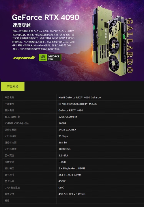 另外,顯卡采用金屬背板,強(qiáng)化加固。參數(shù)方面,RTX 4090 采用 AD102 GPU,擁有 16384 個(gè) CUDA 核心,24GB GDDR6X 顯存,默認(rèn) TDP 為 450W。