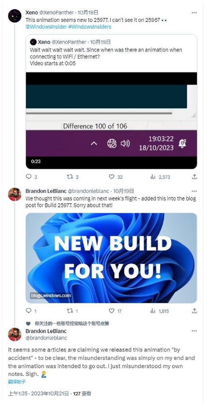 Xeno 表示這個動畫僅出現(xiàn)在 Build 25977 預(yù)覽版中,并未在 Build 25967 預(yù)覽版中存在。微軟的 Brandon LeBlanc 隨后證實了這一添加,并指出他認(rèn)為該功能計劃于下周發(fā)布。