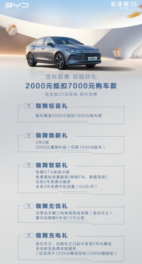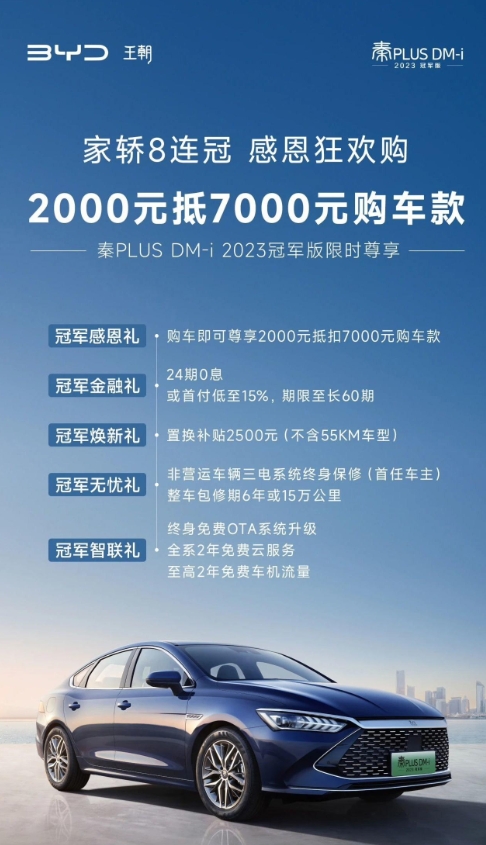 比亞迪秦 PLUS DM-i 冠軍版、驅(qū)逐艦 05 冠軍版車型限時(shí)開啟“2000 抵 7000 元”活動(dòng) 09:35:15