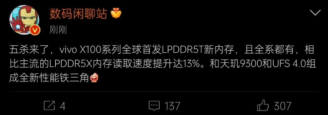 此外,博主 @數(shù)碼閑聊站 也放出了同樣的消息,并稱 vivo X100 系列全系搭載 LPDDR5T 內(nèi)存,和天璣 9300 和 UFS4.0 組成全新性能鐵三角。
