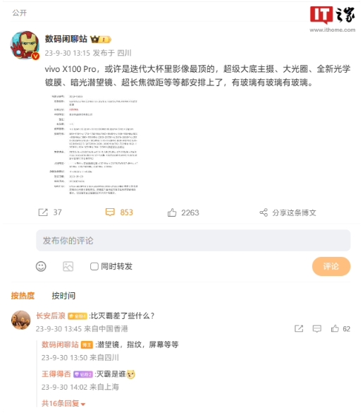 博主 @數(shù)碼閑聊站 此前還稱 vivo X100 Pro 影像方面“或為迭代大杯機型最頂”,配有超級大底主攝、大光圈、全新光學(xué)鍍膜、暗光潛望鏡、超長焦微距等等,并強調(diào)該機“有玻璃”。
