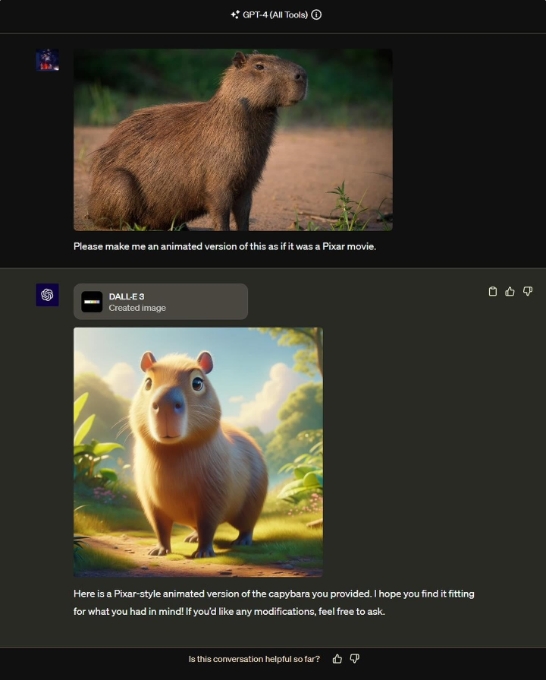 ChatGPT 新功能不僅限于處理文本文件。在 Threads 上,有用戶發(fā)布了一段對話的截圖,他們上傳了一張水豚的圖片,ChatGPT 可以通過 DALL-E 3 根據(jù)它創(chuàng)建一個皮克斯風格的圖片。然后他們又上傳了另一張圖片,這次是一塊扭曲的滑板,并要求 ChatGPT 將它插入上述圖片,ChatGPT 也成功做到了,不知道為什么還給水豚戴上了帽子。