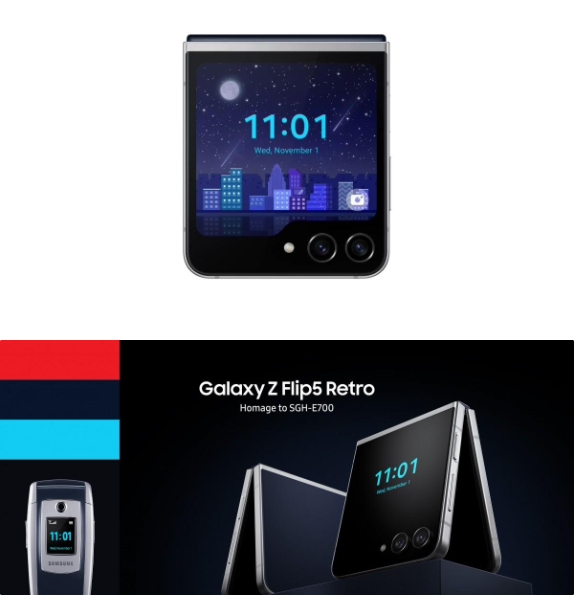 Galaxy Z Flip 5 Retro 身上有一些 SGH-E700 的元素,比如靛藍(lán)和銀色的配色,并在其 Flex Window 外屏上設(shè)計了一些懷舊的像素圖形、UI 和城市景觀動畫。