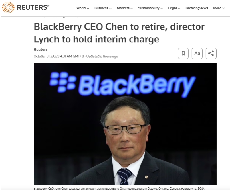 現(xiàn)年 68 歲的程守宗于 2013 年 11 月加入黑莓。黑莓曾以其全鍵盤商務手機而聞名,但自 2007 年蘋果推出 iPhone 和安卓智能手機迅速普及后,其業(yè)務受到了重創(chuàng)。從那以后,黑莓轉向專注于網(wǎng)絡安全、車載軟件和物聯(lián)網(wǎng)(IoT)應用。