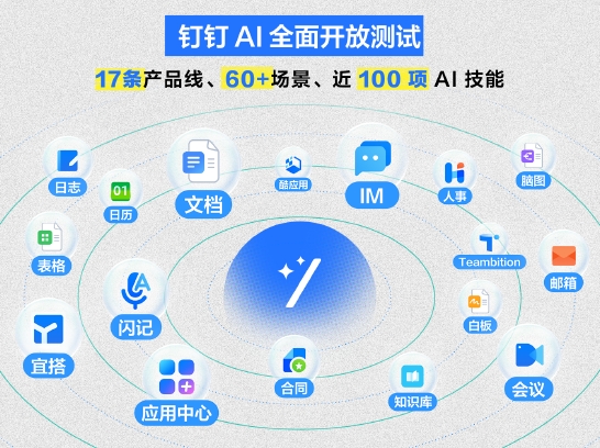 在超過50萬家企業(yè)內(nèi)測后,釘釘AI魔法棒正式上線,釘釘聊天、文檔、知識庫、腦圖、閃記、Teambition等17項(xiàng)產(chǎn)品、60+場景全面開放測試。