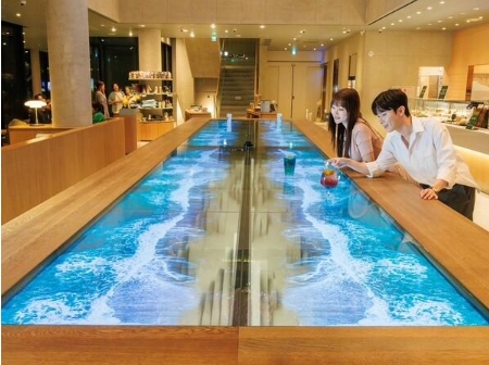透明的 OLED 桌子被放置在商店一樓的中央,當(dāng)飲料杯放在桌子上時,傳感器會做出反應(yīng)并在玻璃杯周圍產(chǎn)生波浪效應(yīng)。