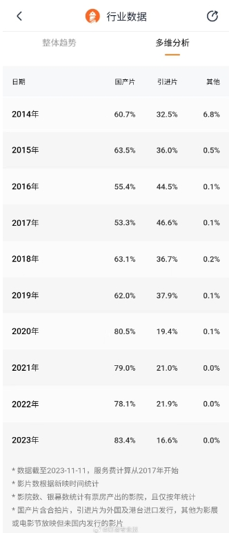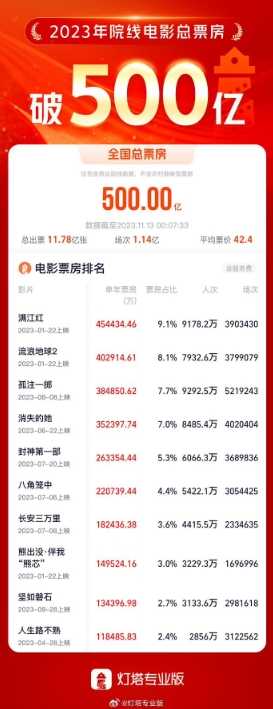 燈塔專業(yè)版數(shù)據(jù)顯示,中國 2023 年度總票房突破 500 億,當(dāng)前全年票房中,國產(chǎn)片票房占 83.4%,為近 10 年最高;引進(jìn)片票房占比 16.6%。當(dāng)前排名本年票房前十的影片全部為國產(chǎn)片。