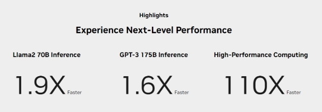 根據(jù)官方發(fā)布的圖片,H200在大模型Llama 2、GPT-3.5的輸出速度上分別是H100的1.9倍和1.6倍,在高性能計(jì)算HPC方面的速度更是達(dá)到了雙核x86 CPU的110倍。