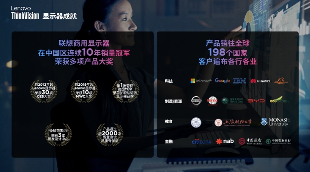 基于過往的產(chǎn)品和技術(shù)的深厚積淀,截至目前聯(lián)想ThinkVision顯示器在全球范圍內(nèi)擁有3家研發(fā)設(shè)計(jì)中心,產(chǎn)品已在全球198個(gè)國家和地區(qū)銷售,用戶遍布科技、制造、教育、金融等各行各業(yè)。IDC的數(shù)據(jù)顯示,聯(lián)想ThinkVision顯示器已連續(xù)10年在中國商用市場保持第一位,在聯(lián)想2023/24財(cái)年第二季度排名全球前三。