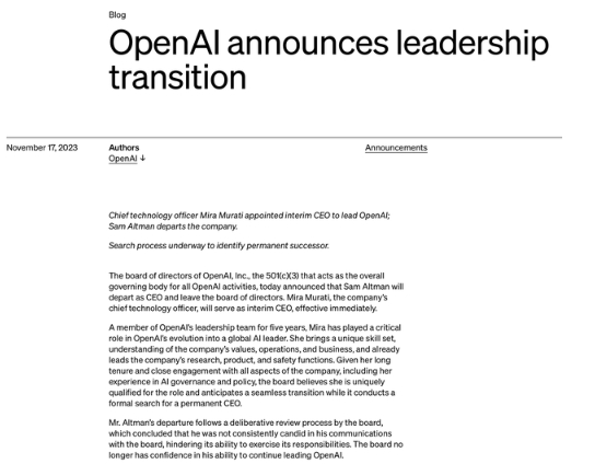 11月17日,因ChatGPT而名聲大噪的OpenAI在官網(wǎng)發(fā)布新聞稿稱(chēng),公司董事會(huì)宣布,CEO薩姆·奧特曼(Sam Altman)將辭去CEO并離開(kāi)公司,首席技術(shù)官米拉·穆拉蒂(Mira Murati)將擔(dān)任臨時(shí)首席執(zhí)行官,立即生效。