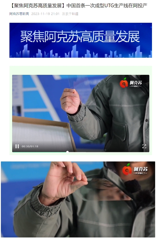 據(jù)阿克蘇地區(qū)融媒體中心“阿克蘇零距離”公眾號報道,中國首條一次成型超薄柔性電子玻璃(UTG)生產(chǎn)線在東旭集團新疆阿克蘇光電產(chǎn)業(yè)園投產(chǎn)。