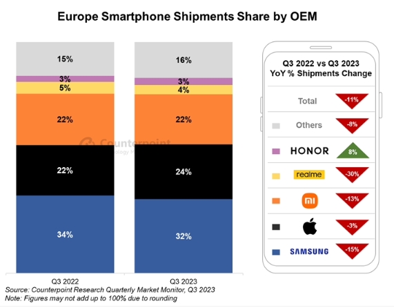 2023Q3 歐洲手機市場報告:三星市占第一、蘋果份額增至 24%、小米穩(wěn)定第三、榮耀唯一正增長 09:10:29