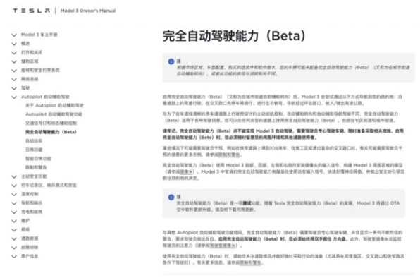 而就在這兩天,在特斯拉中國官網(wǎng)的車主手冊里,也出現(xiàn)了完全自動駕駛能力(Beta)的功能的功能介紹。