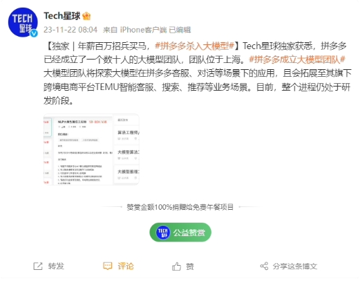 據(jù) Tech 星球,拼多多已經(jīng)成立了一個(gè)數(shù)十人的 AI 大模型團(tuán)隊(duì),團(tuán)隊(duì)位于上海。