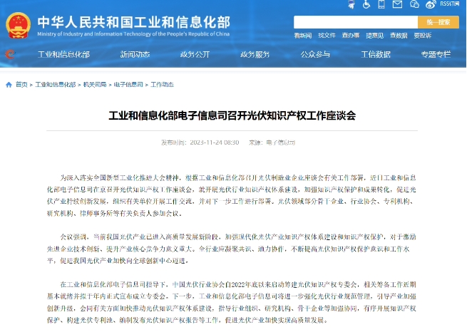 據(jù)工業(yè)和信息化部官網(wǎng)消息,近日工業(yè)和信息化部電子信息司在京召開光伏知識產(chǎn)權工作座談會,就開展光伏行業(yè)知識產(chǎn)權體系建設,加強知識產(chǎn)權保護和成果轉(zhuǎn)化,促進光伏產(chǎn)業(yè)持續(xù)創(chuàng)新發(fā)展,組織有關單位開展工作交流,并對下一步工作進行部署。光伏領域部分骨干企業(yè)、行業(yè)協(xié)會、專利機構、研究機構、律師事務所等有關負責人參加會議。