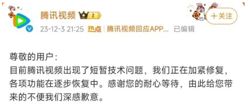 騰訊視頻官方微博3日晚發(fā)文稱,目前騰訊視頻出現(xiàn)了短暫技術(shù)問(wèn)題,正在加緊修復(fù),各項(xiàng)功能在逐步恢復(fù)中。