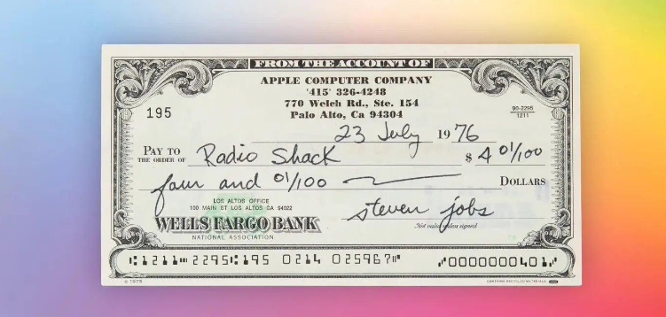 這張支票于 1976 年 7 月 23 日由喬布斯親筆簽名,采用蘋(píng)果公司特殊的 6*3 支票設(shè)計(jì),由喬布斯支付給 Radio Shack,開(kāi)票金額為 4.01 美元。