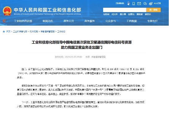 工信部官方表示,中國(guó)電信集團(tuán)有限公司已獲得國(guó)際電信聯(lián)盟批準(zhǔn),取得 E.164 碼號(hào)(882)52 及 E.212 碼號(hào)(901)09,分別作為天通衛(wèi)星業(yè)務(wù)的用戶撥號(hào)碼號(hào)和網(wǎng)絡(luò)識(shí)別碼號(hào),這是我國(guó)電信企業(yè)首次獲得用于衛(wèi)星通信業(yè)務(wù)的國(guó)際電信碼號(hào)資源。