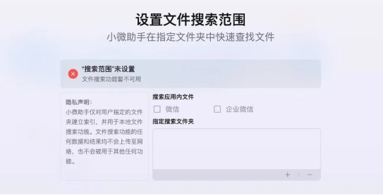 小微助手提供 Windows、macOS 雙端安裝包,用戶可根據(jù)自己的系統(tǒng)平臺選擇安裝包下載使用。打開 App 會開始簡單的引導,用戶可以對該應用的搜索權限進行限制,以及呼出的快捷方式進行設定。