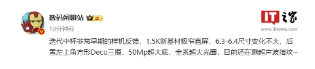 該博主透露,這款迭代中杯早期樣機(jī)配備 1.5K 新基材極窄直屏,機(jī)身尺寸為 6.3-6.4 英寸,后置左上角方形 Deco 三攝,配備 50Mp 超大底以及全系超大光圈,目前還在測超聲波指紋。