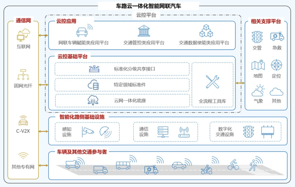 車路云一體化產(chǎn)業(yè)鏈參與者眾多。業(yè)內(nèi)一般將車路云一體化系統(tǒng)劃分為五大部分,即車輛及其他交通參與者、路側(cè)基礎設施、云控平臺、相關支撐平臺、通信網(wǎng)。