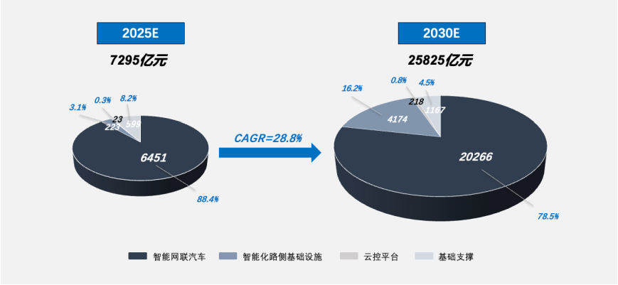 中國汽車工程學會研究顯示,預計2025年、2030年車路云一體化智能網(wǎng)聯(lián)汽車產(chǎn)業(yè)產(chǎn)值增量為7295億元、25825億元,增長勢頭強勁。另據(jù)賽迪前瞻產(chǎn)業(yè)研究院報告,2030年中國智能網(wǎng)聯(lián)車市場規(guī)模有望突破5萬億元,車路云一體化相關市場規(guī)模超14萬億元。