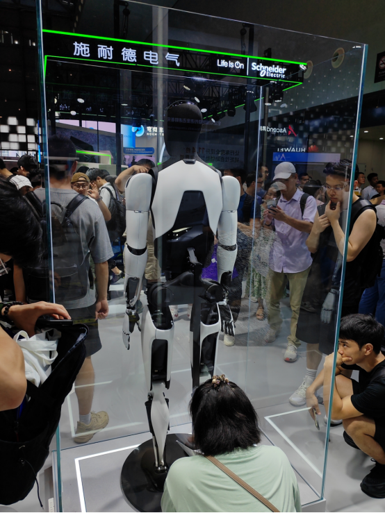 7月6日的WAIC展會(huì)上,展館內(nèi)的很多設(shè)置、展品,對(duì)普通觀眾都非常友好。頗為吸睛的“十八金剛”人形機(jī)器人先鋒陣列,擺放在最顯眼的入口處,各式各樣的人形機(jī)器人引發(fā)觀眾連連驚嘆。
