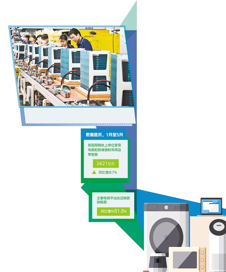 數(shù)據(jù)顯示,1月至5月,我國限額以上單位家用電器和音像器材類商品零售額3421億元,同比增長7%;主要電商平臺以舊換新銷售額同比增長81.8%。