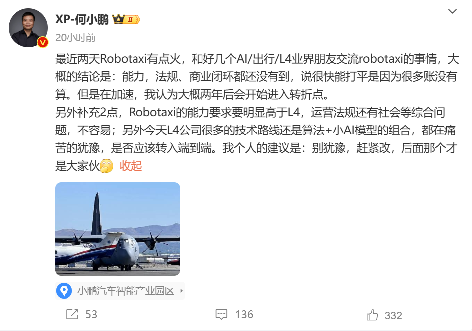 小鵬汽車董事長何小鵬近期在微博上發(fā)表觀點,預(yù)測Robotaxi將在兩年后迎來轉(zhuǎn)折點。他指出,盡管目前Robotaxi在技術(shù)能力、法規(guī)和商業(yè)閉環(huán)方面尚未完全成熟,但發(fā)展速度正在加快。何小鵬特別強調(diào)了端到端技術(shù)路線的重要性,認為這將是推動自動駕駛技術(shù)發(fā)展的關(guān)鍵。