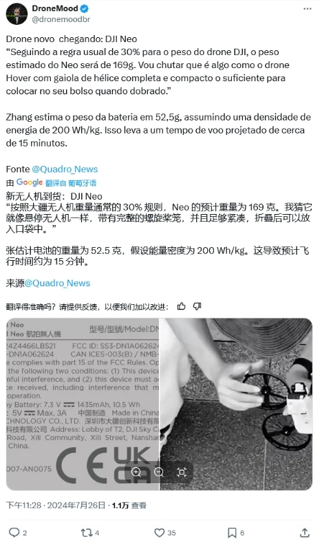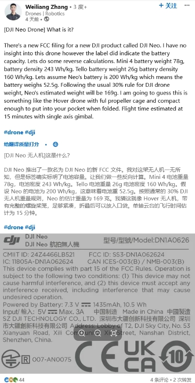 無人機業(yè)內(nèi)人士 Weiliang Zhang 在其 LinkedIn 賬號發(fā)布動態(tài),基于 FCC 認證文件信息,基于大疆 Mini 4(電池重量 78 克,電池密度 243 Wh/kg)、大疆 Tello(電池重量 26 克,電池密度 160 Wh/kg),推測大疆 Neo 無人機的電池重量為 52.5 克,密度為 200 Wh/kg。
