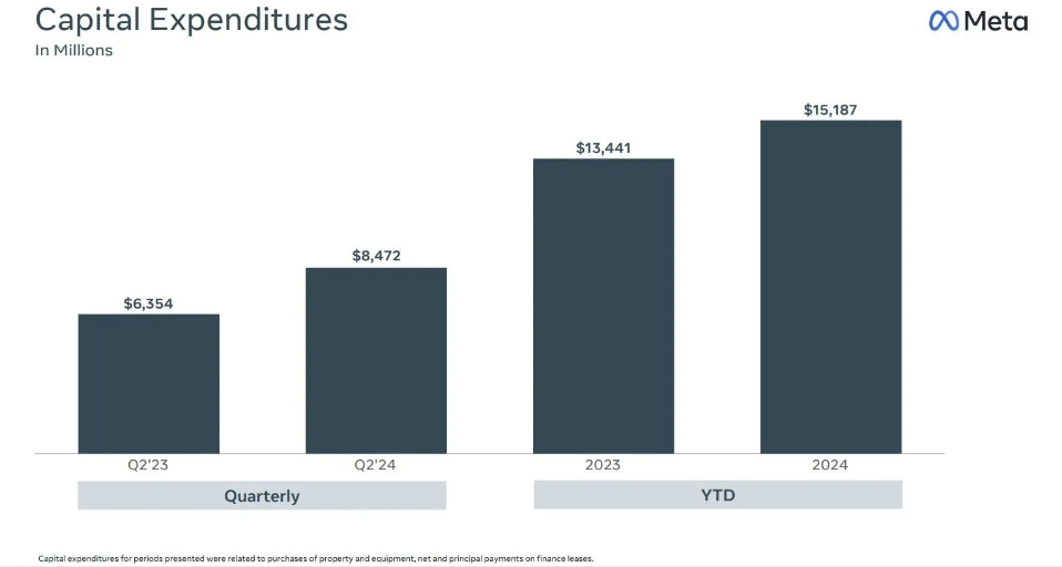 華爾街最關(guān)注指標莫過于包含AI投資的資本支出,原本市場預(yù)計Meta二季度資本支出將同比增約50%至95億美元,令2024全年的資本支出額達到近380億美元。