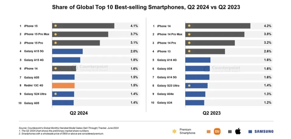 IT之家 8 月 1 日消息,市場調(diào)查機(jī)構(gòu) Counterpoint Research 昨日(7 月 31 日)發(fā)布博文,公布了 2024 年第 2 季度全球搜最暢銷智能手機(jī)排行榜,在前十榜單中蘋果、三星繼續(xù)占據(jù)主導(dǎo)地位,共瓜分了 9 個(gè)席位,小米憑借著 Redmi 13C 4G 手機(jī)位居第八。