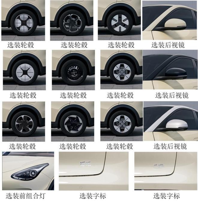新車可選雙色或單色車身,長寬高分別為 4135/1805/1570mm,軸距 2650mm;提供了豐富的輪轂樣式供用戶選擇,包含多款 4 輻、5 輻、6 輻樣式。此外,該車還提供了“派派”“龍貓”兩種尾標(biāo)供選擇,預(yù)計為該車的備選名稱。