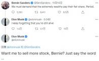 世界首富伊隆·馬斯克周日與美國參議員伯尼·桑德斯爆發(fā)口水戰(zhàn)并提到賣出更多特斯拉股票,一天前桑德斯在推特上寫道:我們必須要求那些