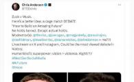 馬斯克周二在回應(yīng)一位X用戶的提議時表示,和扎克伯格來一場籠中辯論賽也是個不錯的注意?! ED 演講創(chuàng)始人克里斯·安德森(Chris An